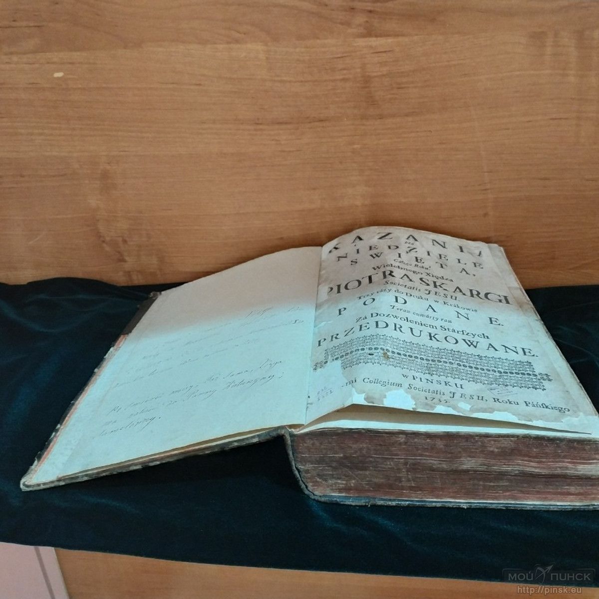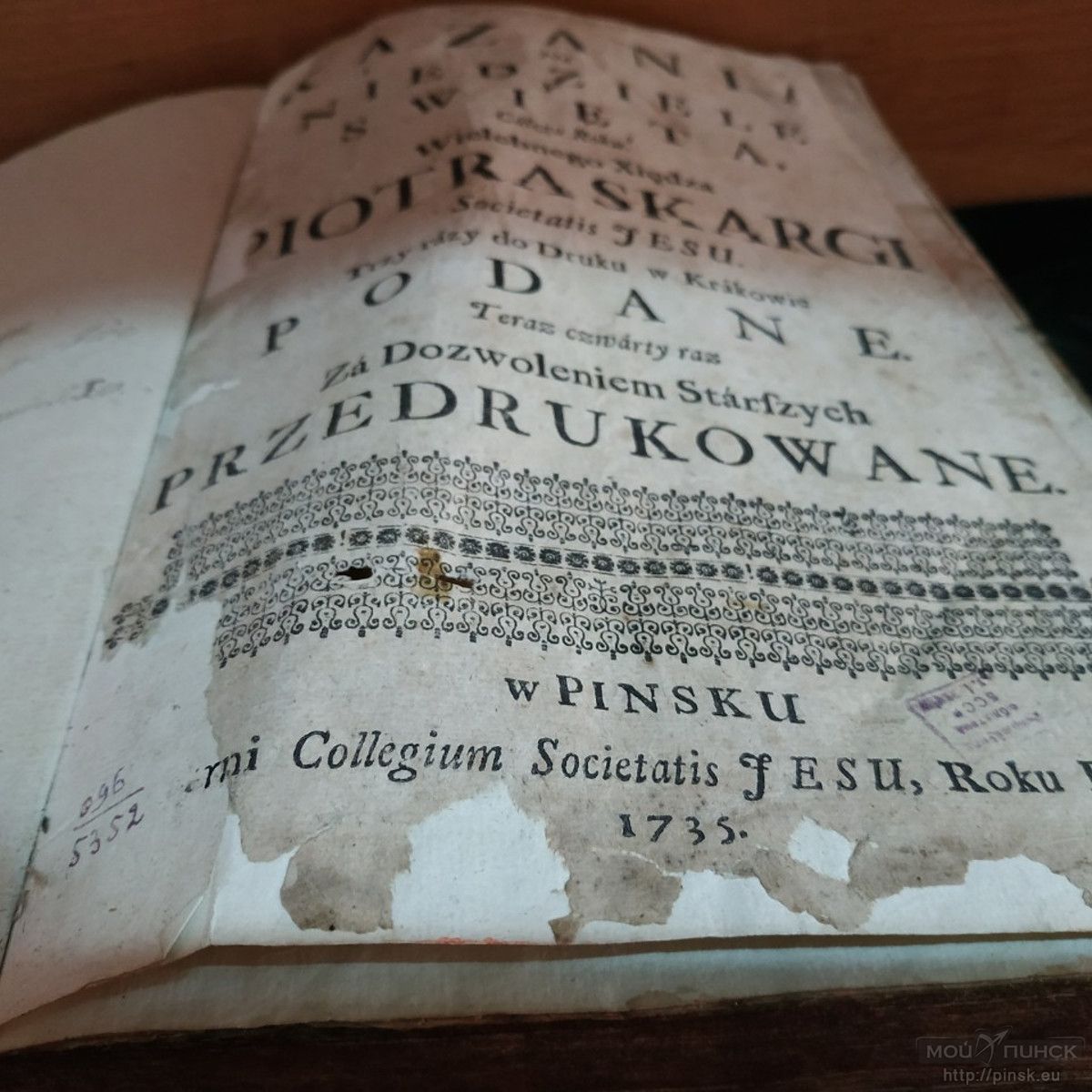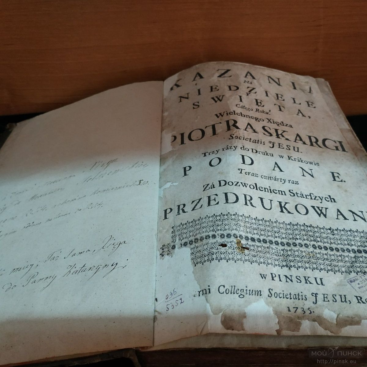 В Пинске иезуиты появились в 1630 году по просьбе пинского стольника М. Ельского, — рассказывает pinsk.eu заведующий научно-просветительским отделом Музея Белорусского Полесья Валерий Кобринец. — В 1631-1670-е годы на средства пинского старосты Альбрехта Станислава Радзивилла был построен монастырь иезуитов, в состав которого входил и коллегиум. В своё время он был крупным культурно-просветительским центром. Здесь размещалась типография, огромнейшая библиотека, аптека. В типографии было издано несколько книг. Одна из них — "Казанне Пятра Скаргі" ("Kazania na niedziele y święta całego roku") — сейчас хранится в книгохранилищах Национальной библиотеки Беларуси. Именно её мы и решили представить жителям и гостям культурной столицы в рамках нашего музейного проекта.