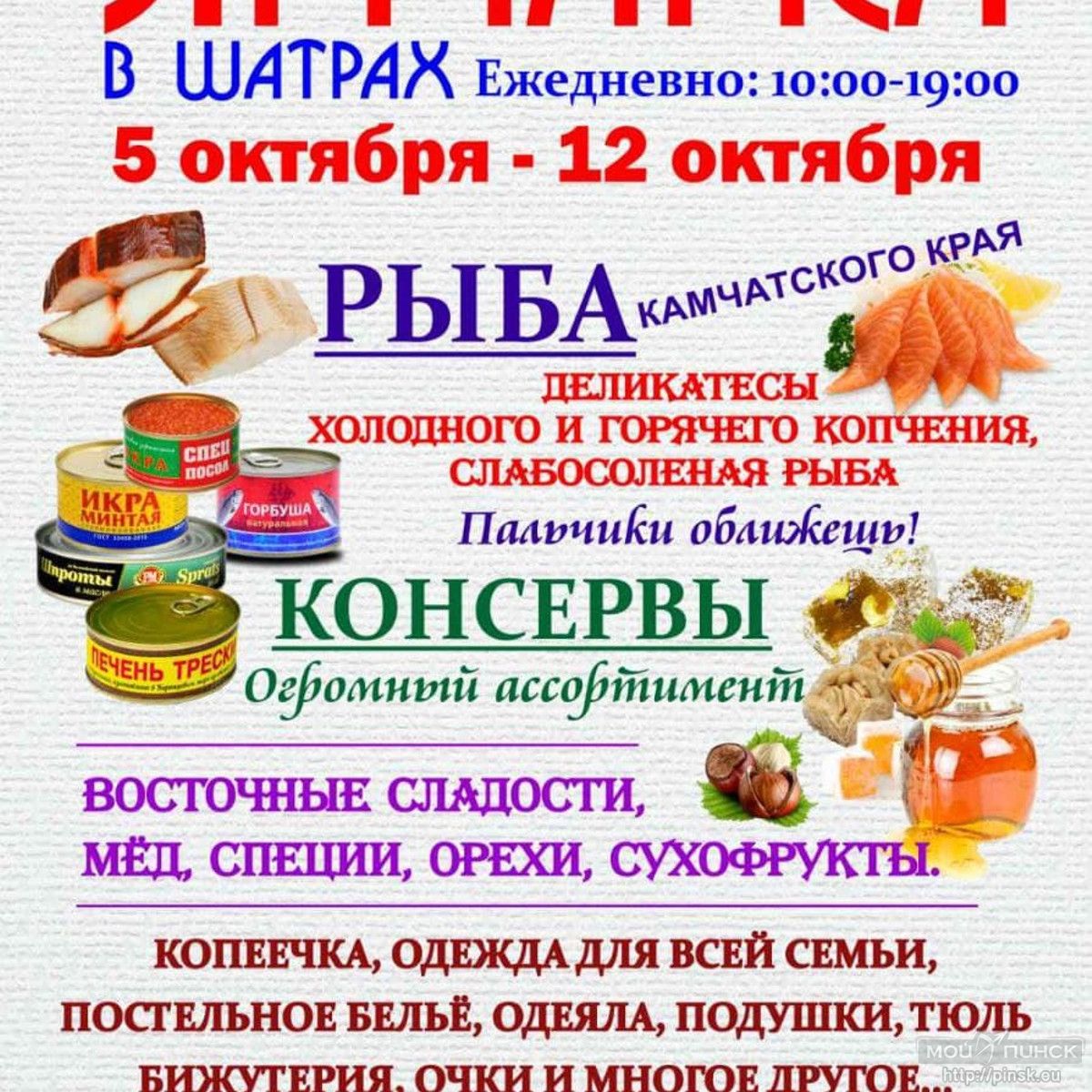 С 5 по 12 октября возле Пинского городского дома культуры, на улице Ленина, 7а, будет проходить полюбившаяся многим белорусам «Ярмарка в шатрах». Выставка-продажа путешествует по городам Беларуси и соседним странам. Завсегдатаи ярмарки всегда спешат на нее за товарами хорошего качества в широком ассортименте и по демократичным ценам.