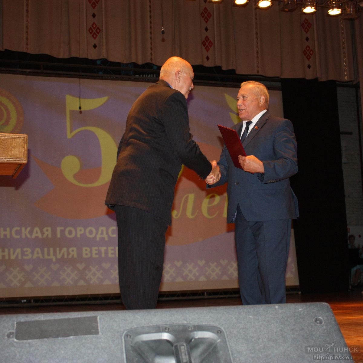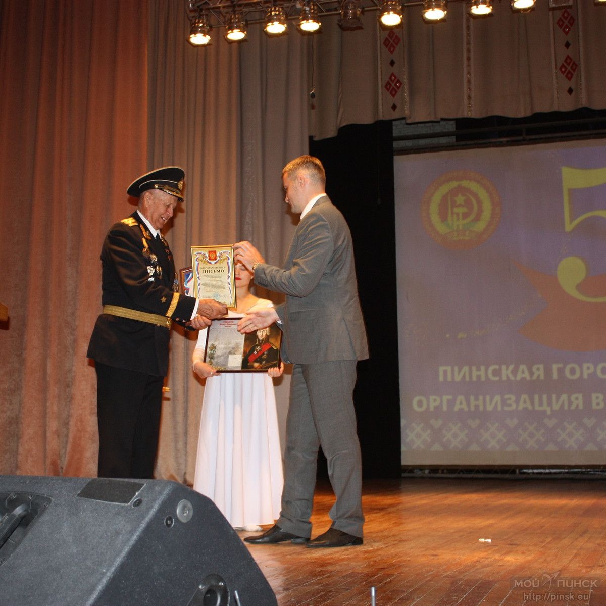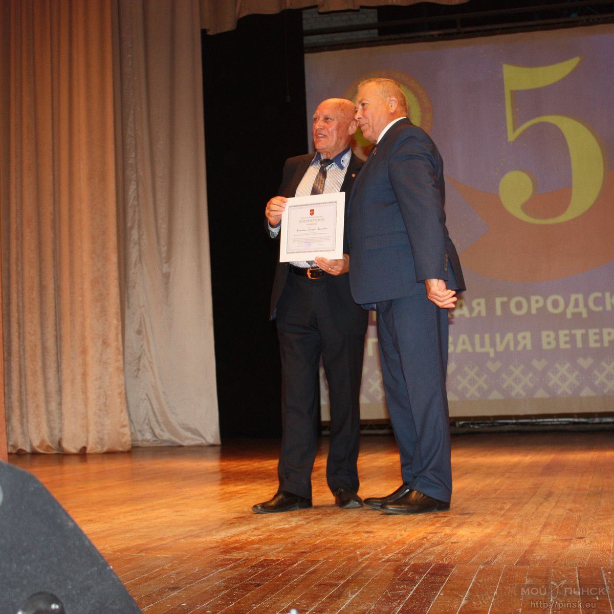 Председатель городского Совета депутатов Лемешевский Леонтий Антонович вручает Почетную грамоту Пинского городского Совета депутатов Председателю Пинской городской организации общественного объединения узников фашизма Левоцкому Василию Ивановичу.