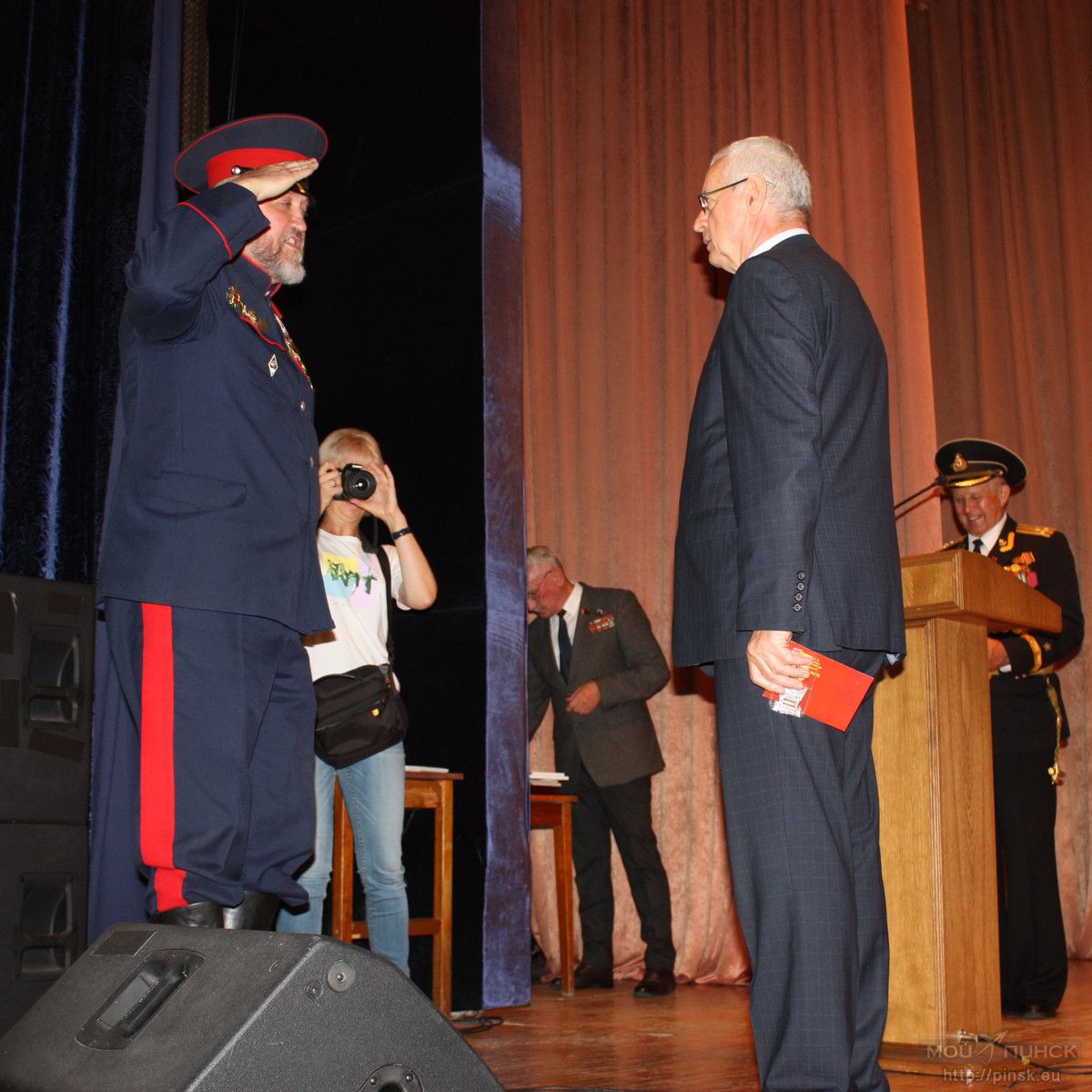 Председатель областного Совета ветеранов Хафизов Вячеслав Талипович вручает медаль дважды героя СССР Грицевца С.И. Ососкову Игорю Александровичу, командиру Пинского казачьего гарнизона.